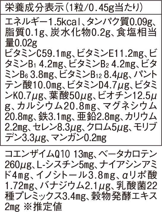 通常のマルチビタミンおよびミネラルがよりも高濃度でバランスよく含まれています。